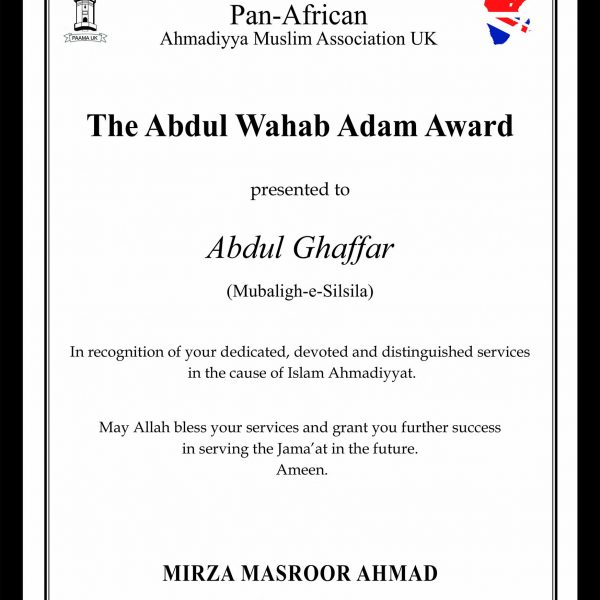 Maulana Abdul Ghaffar trained as a missionary at Jamiah Ahmadiyya Rabwa Pakistan and has served the Jama’at in Ghana, Tuvalu and the United Kingdom in various capacities including Imam of the Baitul Futuh Mosque, London as a missionary. He is currently serving as a Regional Missionary in the United Kingdom.