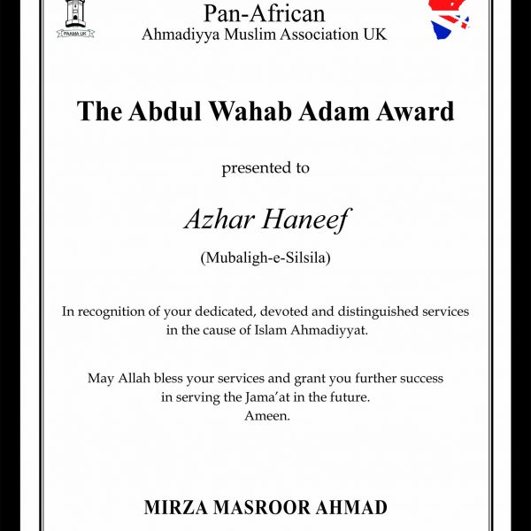 Maulana Azhar Haneef trained as a missionary at Jamiah Ahmadiyya Rabwa Pakistan and has served the Jama’at in the USA in various capacities including Missionary. He is currently serving as Naib Amir USA.