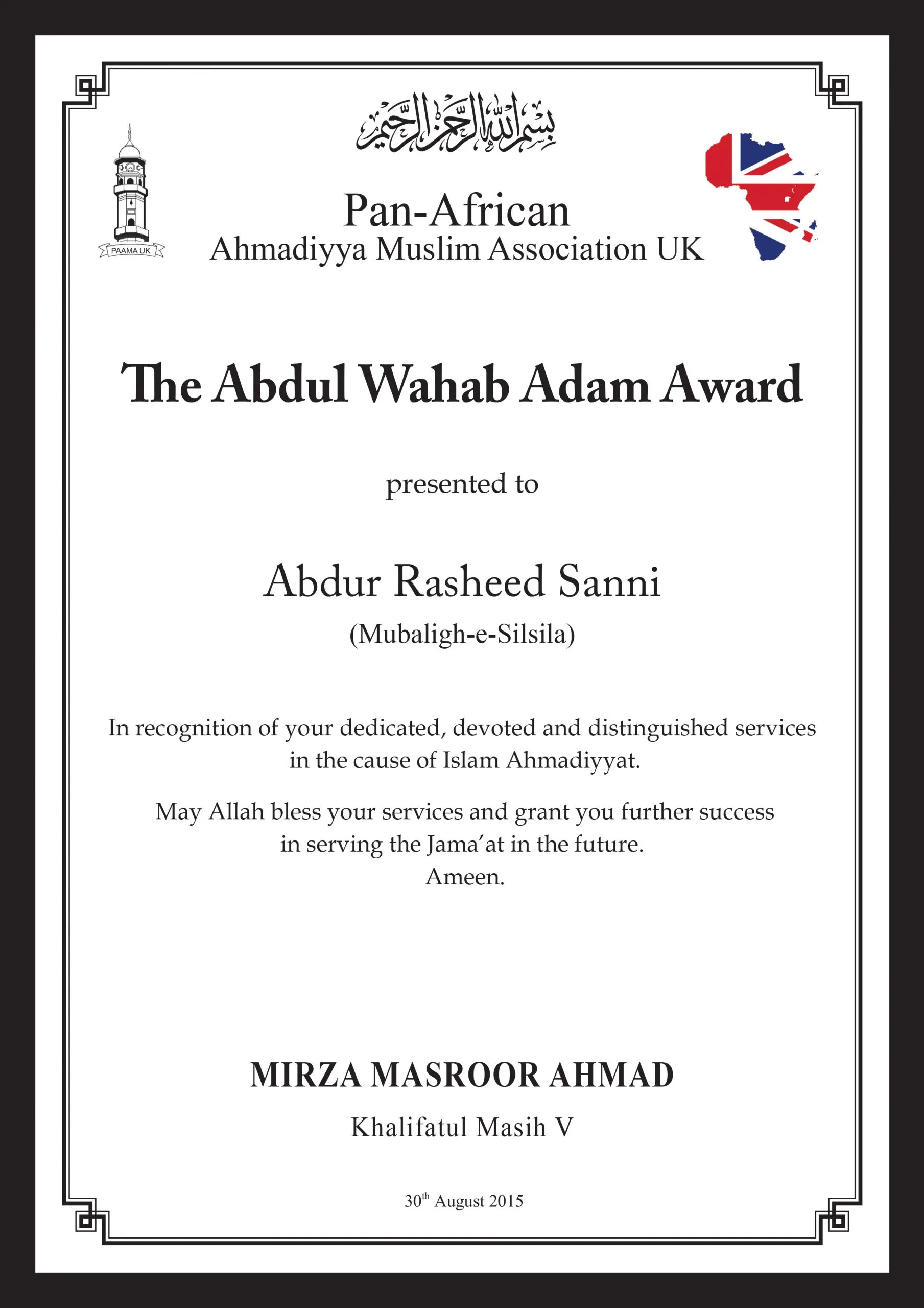 Maulana Abdur Rasheed Sanni trained as a missionary at Jamia Ahmadiyya Pakistan and has since served as a missionary in Nigeria.