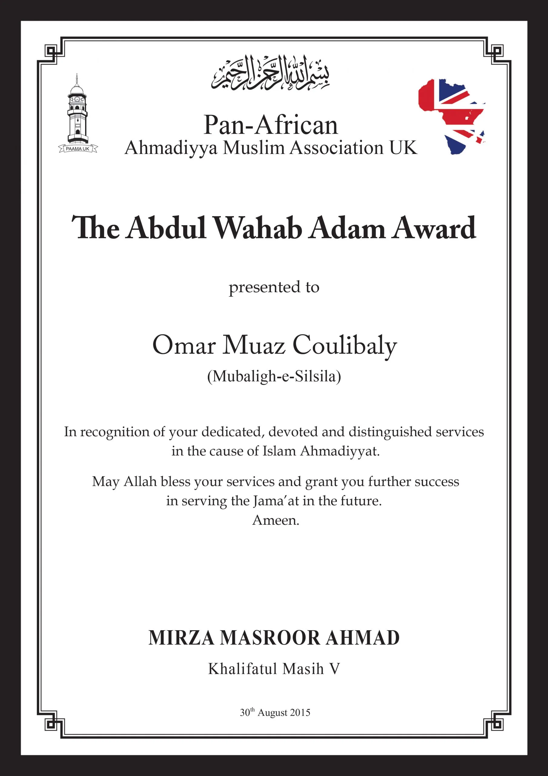 Maulana Omar Muaz Coulibaly trained as a missionary at Jamia Ahmadiyya Pakistan and has since served the Jama’at as a missionary in Mali.