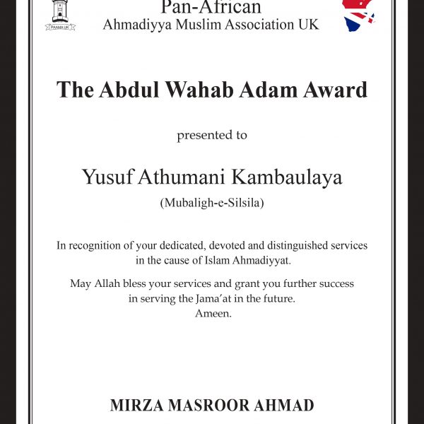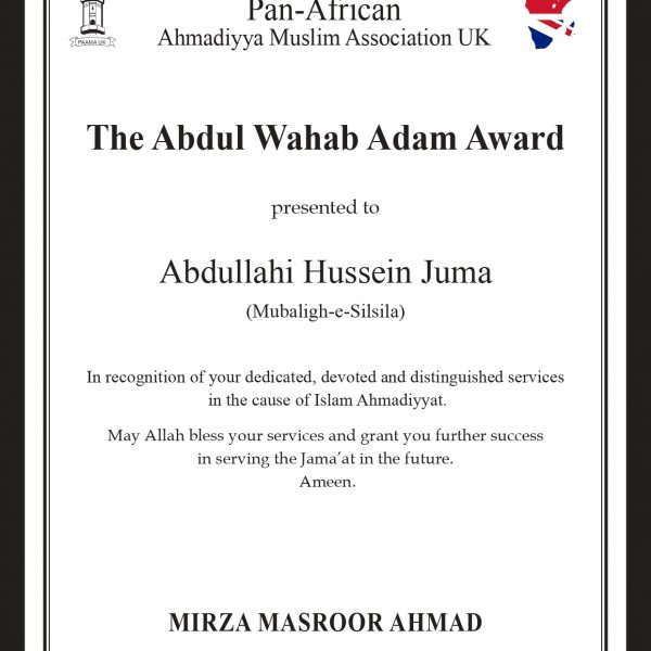 Maulana Abdullah Hussein trained as a missionary at Jamia Ahmadiyya Pakistan and has served the Jama’at in Kenya since 1968. He has also served as the Missionary In-charge Ethopia and for 13 years as the Principal of the Jamia Ahjmadiyya Kenya from 2001 to 2013. Since the year 2014 he has been serving as Muballigh Dawat Illah and Tarbiyyat Nau Mubayyeen in Kenya. He has translated the books ‘Conditions of Bai’at’ and the ‘British Government and Jihad’ into Kiswahili language.